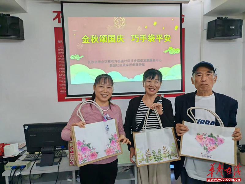 华声在线日讯(通讯员 曹晓祎)为弘扬中华民族尊老敬老的传统美德,营造欢乐祥和、温馨和谐的节日氛围,连日来,在天心区民政局的指导下,长沙市天心区桂花坪街道社区社会组织发展服务中心在金桂社区居家养老服务站、新园社区居家养老服务站、丹桂社区居家养老服务站开展“金秋颂国庆 巧手袋平安”手工包袋制作活动,吸引了众多老年居民热情参与。