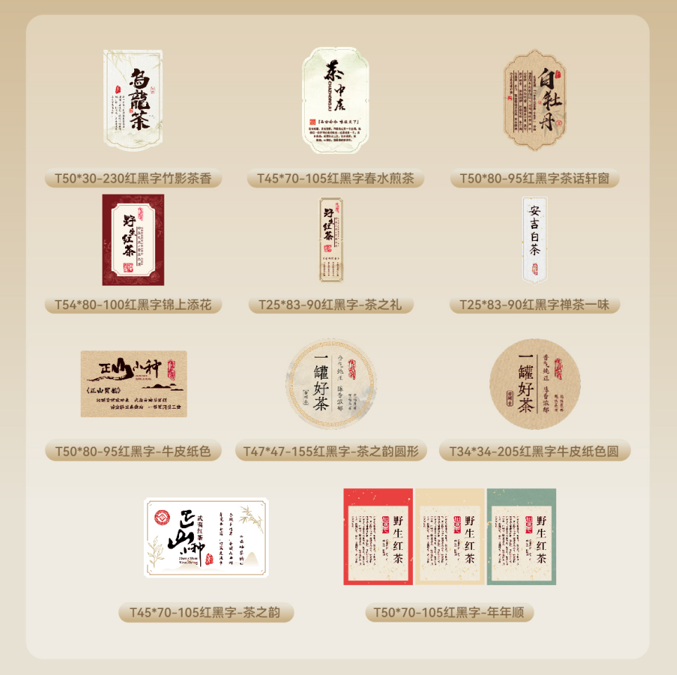 这款新品直击茶叶场景核心需求,首推11款古风专属标签,覆盖茶叶罐封口贴、综合信息标签等高频场景,水墨纹理与传统纹样设计天然适配茶礼调性,茶商无需额外设计即可直接使用,大幅节省中秋旺季包装时间成本。材质上,其耐用性较普通热敏标签提升3倍,防水防油防刮性能升级,且采用不含双酚A的食品级环保材质,既解决茶礼运输储存中的标签损耗问题,也打消消费者对“入口产品标签安全”的顾虑。