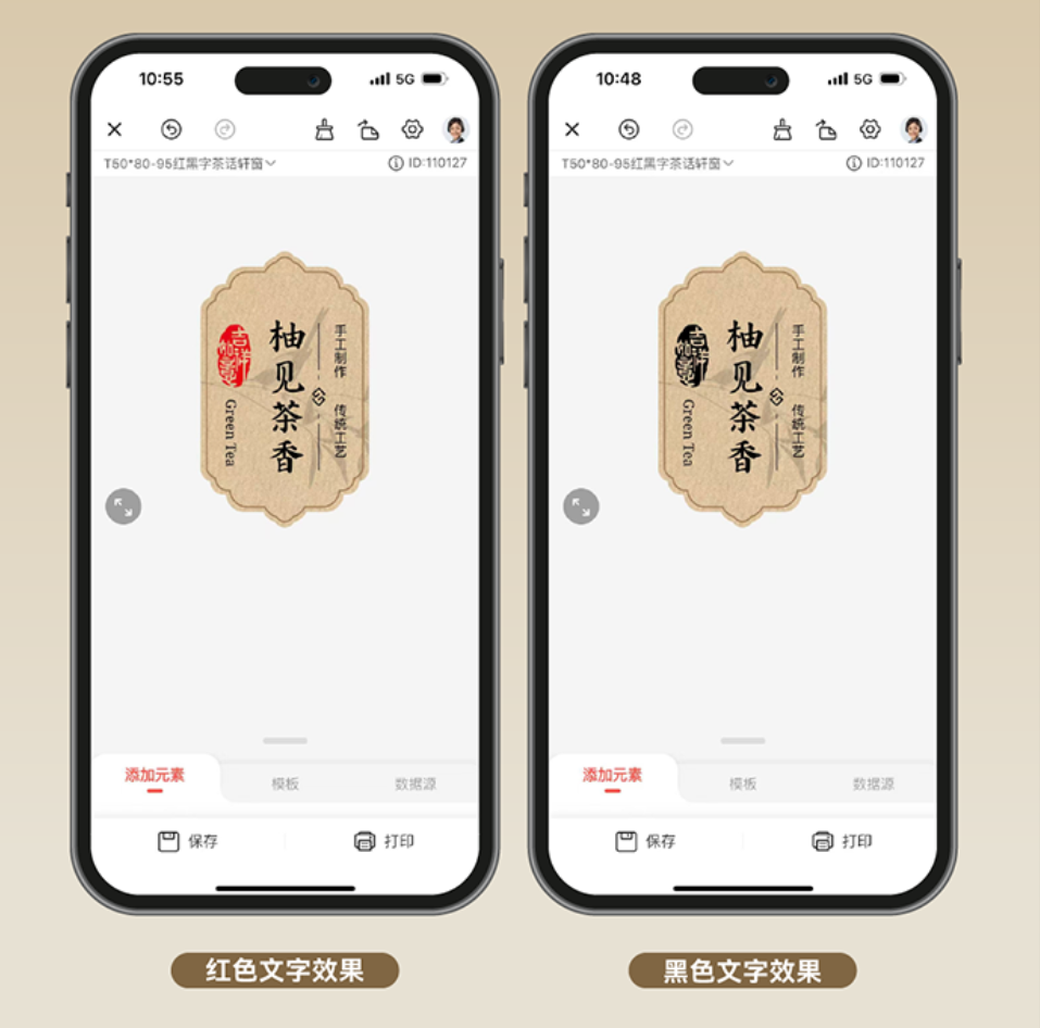 此外,此次上新标签创新红黑双色打印是核心亮点:黑色可打印茶叶名称、保质期等常规信息,红色则适配软件内新增的50 +款茶叶印章素材(如“珍品”“典藏”),中式篆刻风格让标签更加古色古香,更显精致感,贴到茶叶包装上不掉档次。